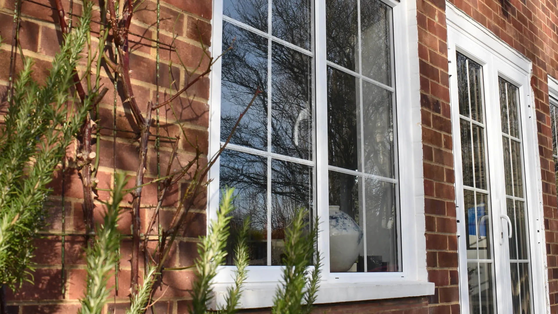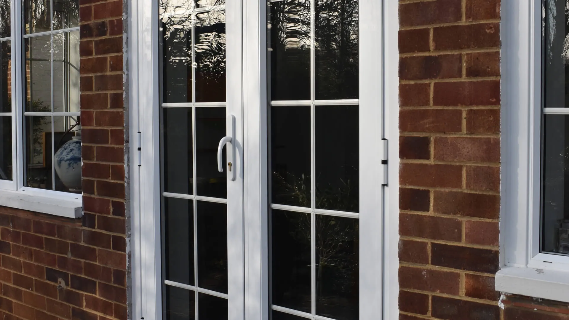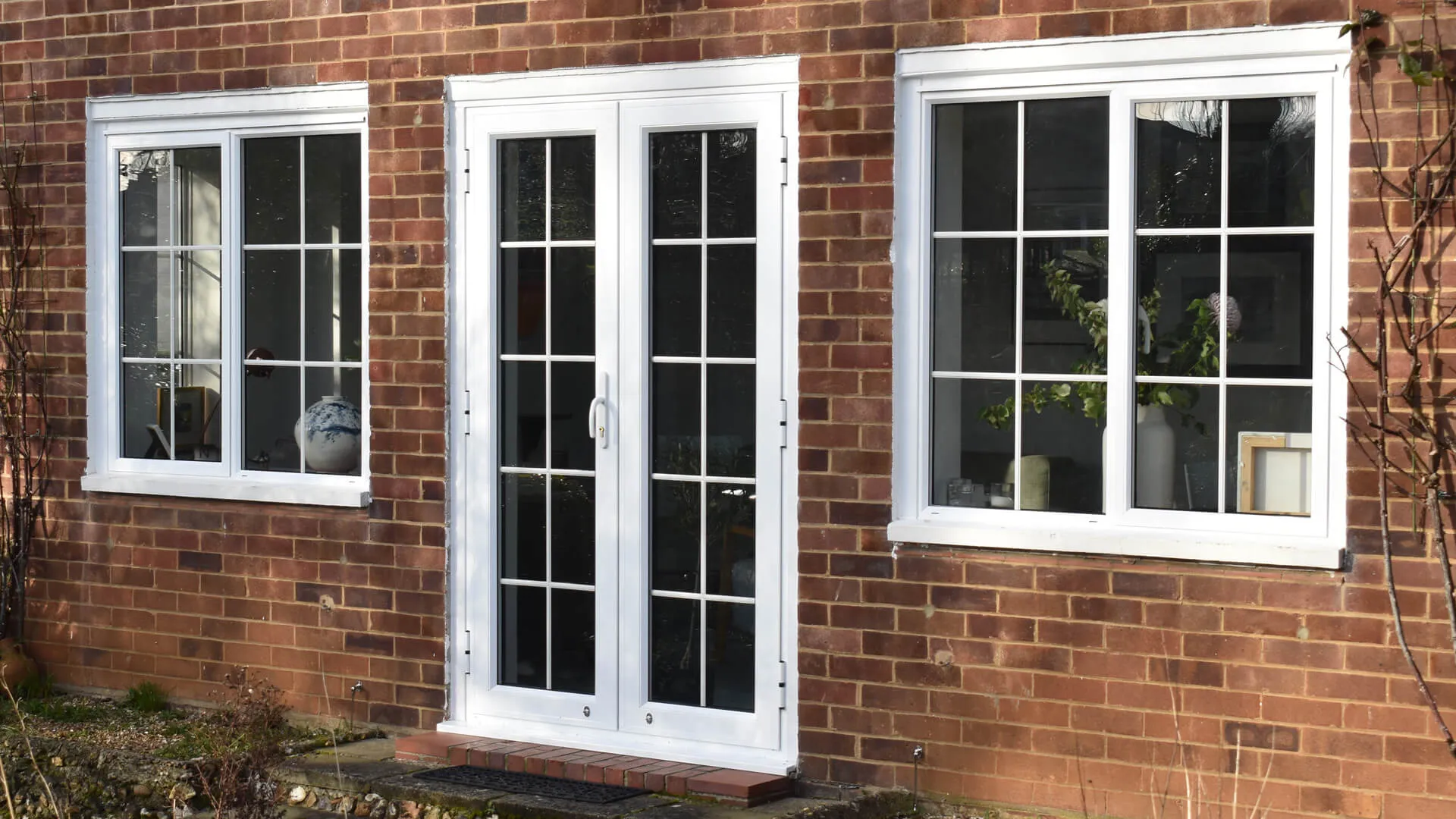 Proceeding with an order for 17 aluminium even-leg casement windows featuring white integral Georgian bars (including a bay window), an interesting design point was requested. Look closely at the matching-coloured French doors that also now inhabit the building to stylishly connect the indoor setting to the outdoor space and you will spot what it is – the door handle is aligned with the frame.