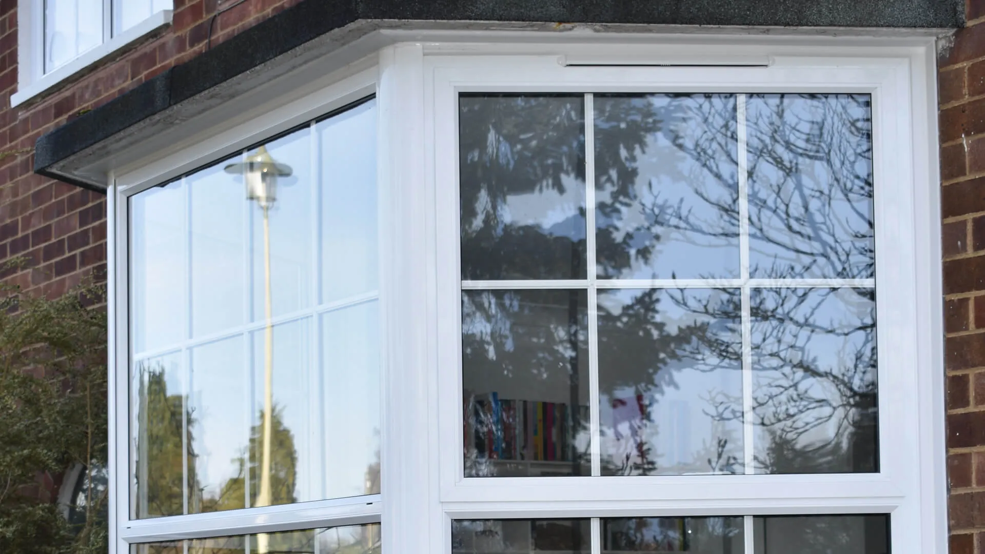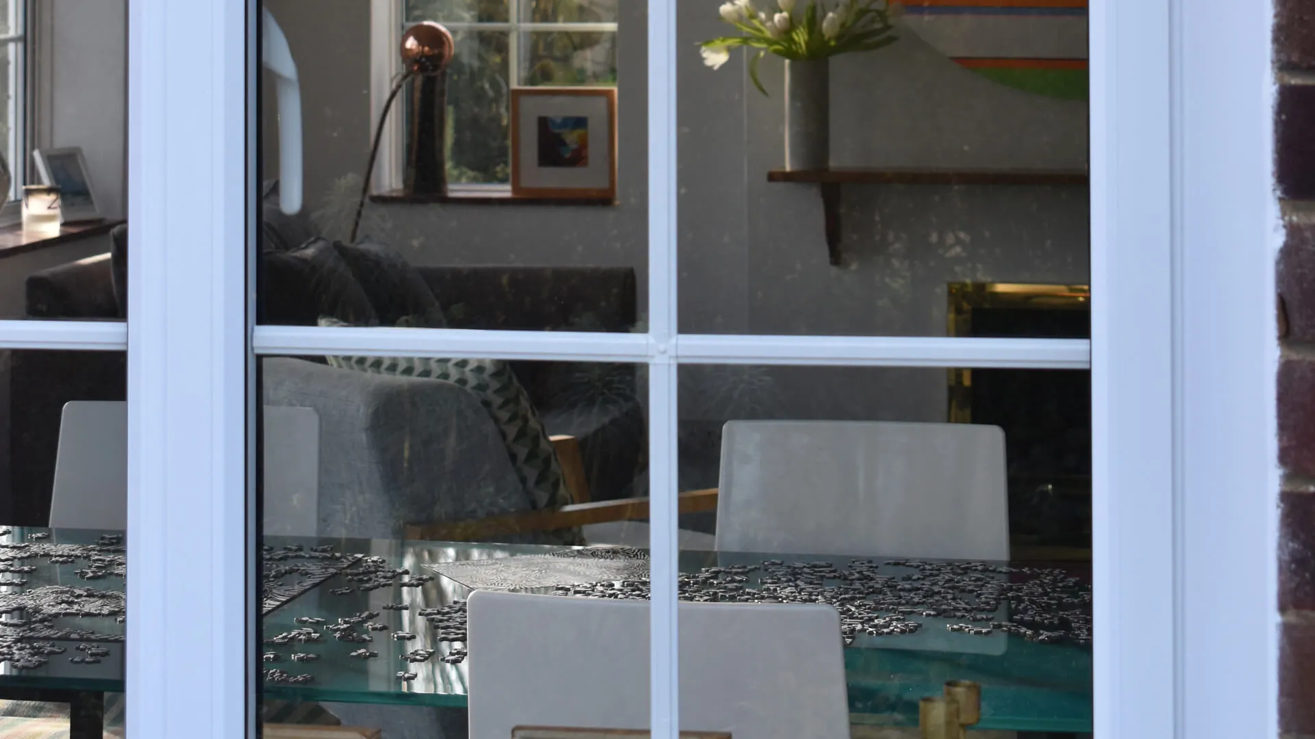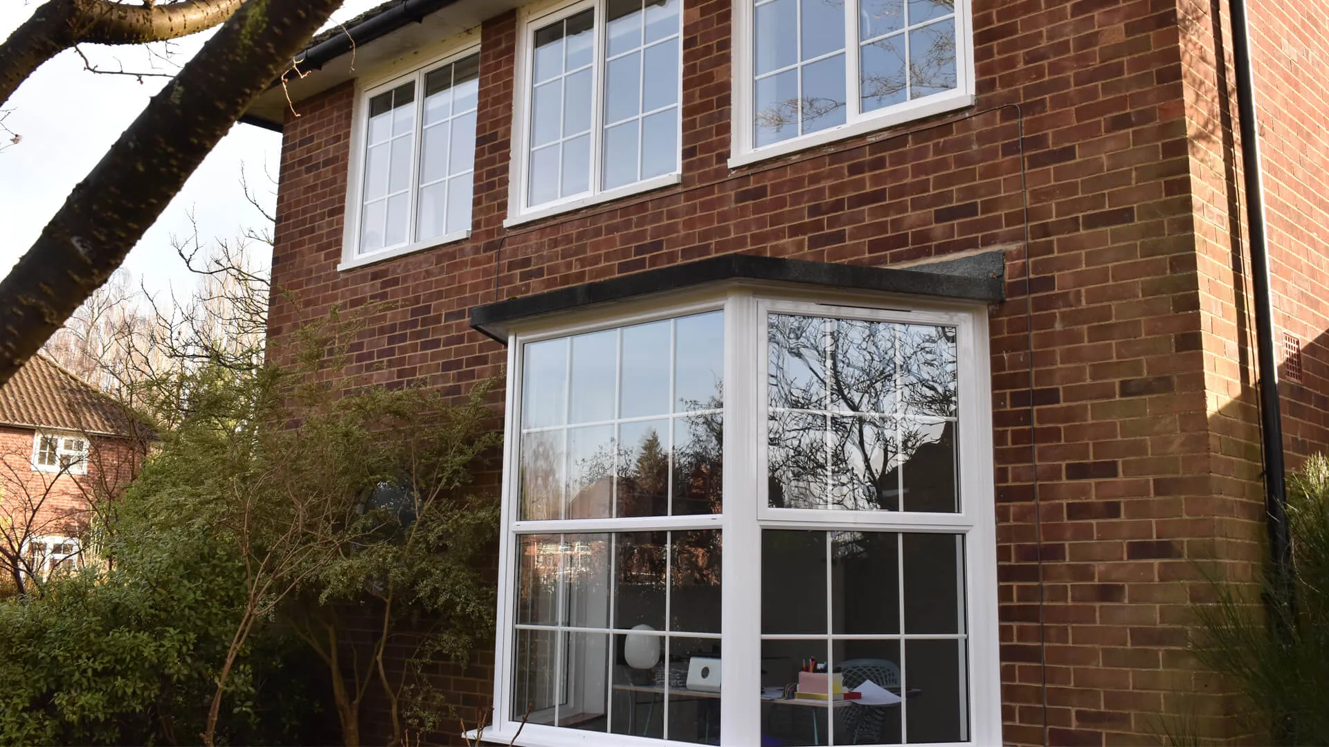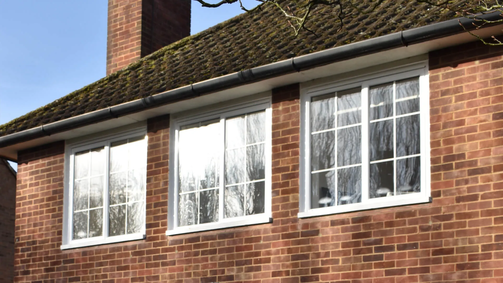 Proceeding with an order for 17 aluminium even-leg casement windows featuring white integral Georgian bars (including a bay window), an interesting design point was requested. Look closely at the matching-coloured French doors that also now inhabit the building to stylishly connect the indoor setting to the outdoor space and you will spot what it is – the door handle is aligned with the frame.