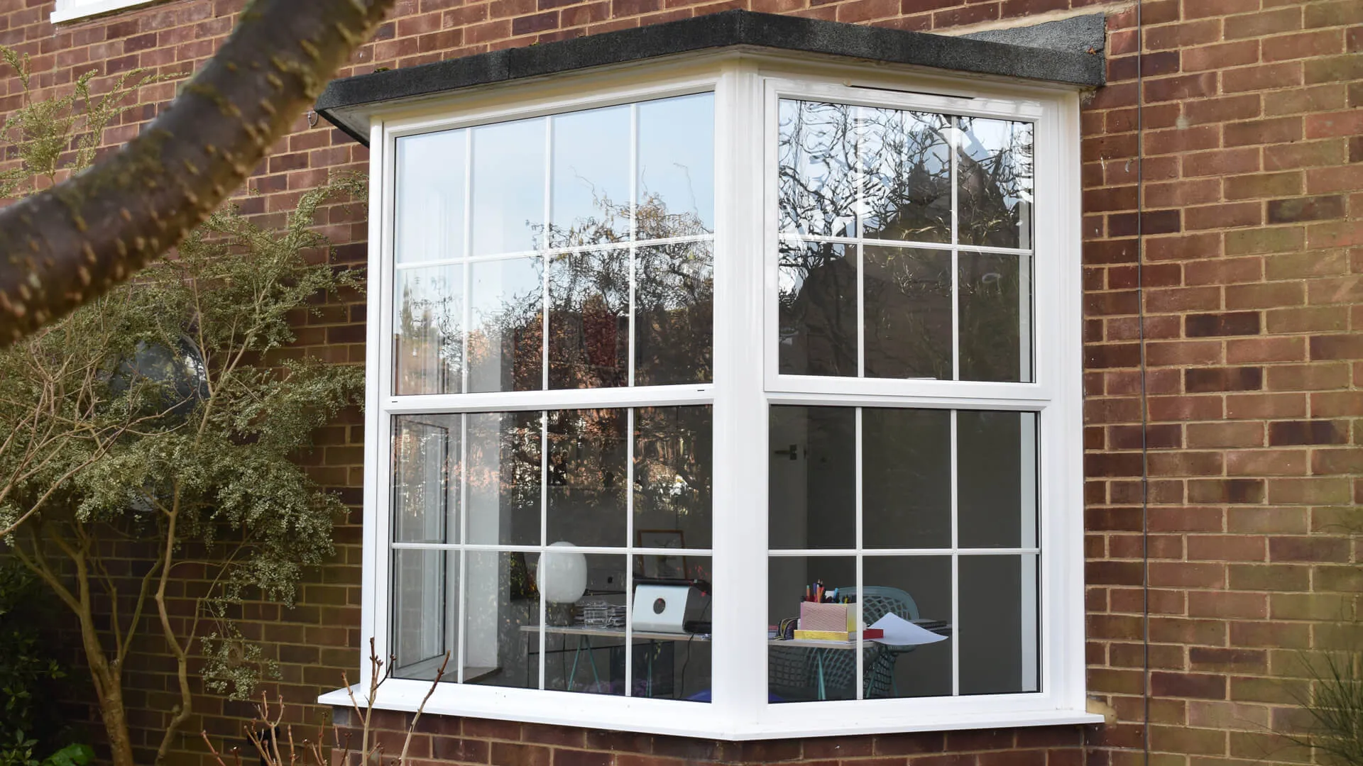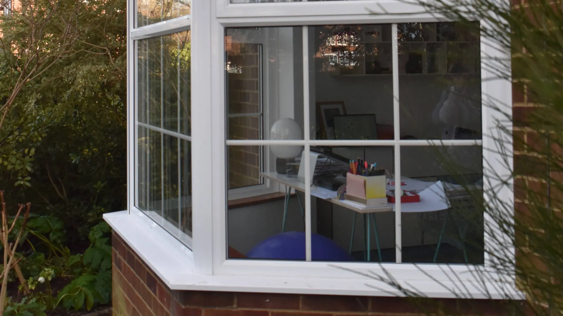 The bay window, along with all the other brand-new openings, is powder-coated in Hipca White (RAL 9910), a popular high-gloss, bright white finish. It appears a small office space has been set-up directly facing the bay, offering a radiant nook for working and panoramic views.